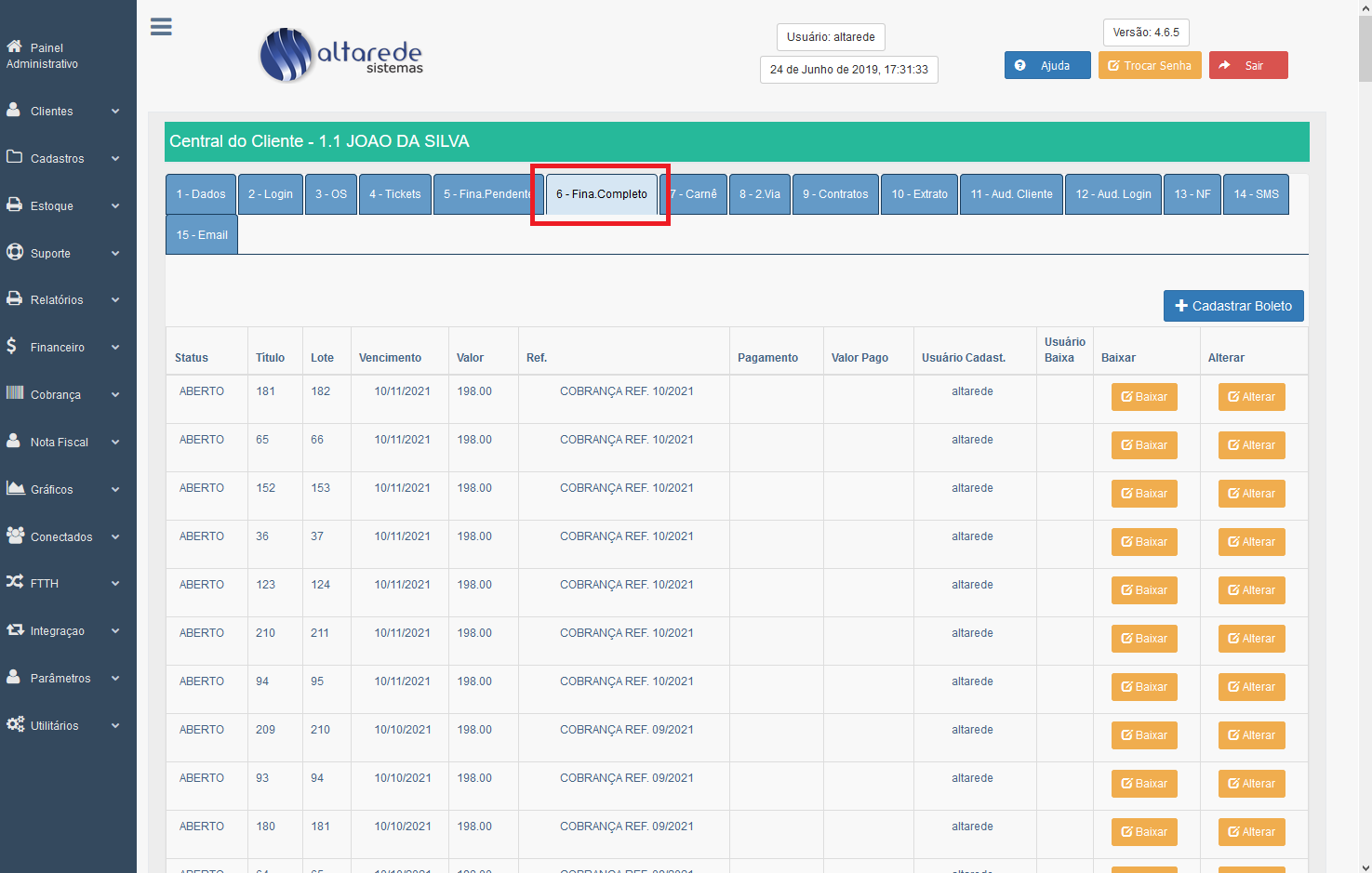 ALTERAR para abrir o cadastro editável (apenas edite se o boleto não for registrado) e Excluir esse boleto.